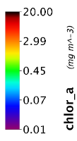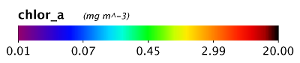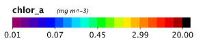The next two images illustrate the application of a scaling factor to improve the readability of labels (in this case for data values which are very small). Both images were made using the same Rrs_678 band.