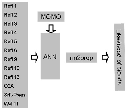 The following figure shows the general structure of the cloud detection algorithm. During development of the algorithm, using the radiative transfer model MOMO, simulated cloud and non-cloud top of atmosphere radiance have been produced and an artificial neural net (ANN) has been trained. This neural net is now used in the Cloud Probability Processor, where it is fed with the reflectances and the pressure as shown in the figure. A post-processing is applied after the net (nn2prop) which scales the output of the neural net into a probability value.