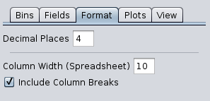This is a tab accessible from within the Statistics window. These parameters enable you to format the text rendition of the statistics results (sush as decimal places) as well as to adjust some formatting to the spreadsheet. The line separator within this tab delineates the aspects which are only applicable to the spreadsheet. Parameters listed below the separator are only applicable to the spreadsheet.