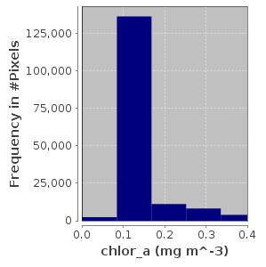 Hint: this feature can be quite useful, especially when a large portion of your data only occupies a narrow span of the full valid range of the data. By not plotting the high and low outliers you can better "see" the data, and better determine whether your specified bin resolution is high enough. If you try this out on chlor_a in a full scene level-2 file, you will likely observe that a bin count of 1000 bins crams most data into just couple bins, whereas a higher bin count such as 10,000 or 100,000 bins will spreads the data out across many bins resulting in a better looking plot and more meaningful percent threshold results.