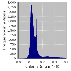 The histogram and percentile plots are created from the binned statistics and hence are dependent on the bin width, which derives from the number of bins and the bin span. The above image illustrates an example of an issue you may encounter if you do not have a reasonable bin resolution. This example uses the chlor_a product of a level-2 file, for the full scene. The image on the left has a bin count of 1,000 and the image on the right has a bin count of 100,000. Both span the default value range of statistics min and statistics max. The plot x-axis span has been reduced to span from 0.0 to 0.4. Keep in mind that the high end of chlor_a can be up to 100.0, which is the high end of its valid pixel expression. Since, for this example, the majority of the data occurs in only a small portion of the binning span data range, a total bin count of 1,000, as shown in the left image, does a poor job of identifying the histogram and data structure.