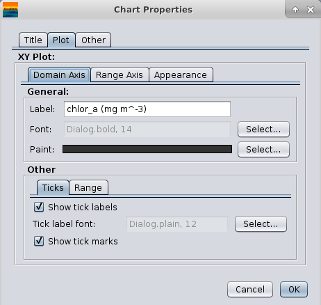 Once you have created the plots, you can more extensively format them. You can edit the range for either axis, edit the axis labels, add a title, alter the colors, and more. To do this, simply right click on the image of the plot and select "Properties". The above editor window will appear. You edit these plots one at a time, so consider using the "Plots" parameter tab for setting this before run.