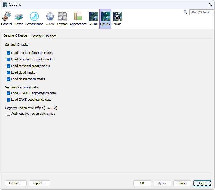 The Sentinel-2 products contain ECMWFT auxilary data and also from the PSD 14.8 CAMSFO auxilary data. By default, all the auxilary data are loaded but the user can select to ignore some of them in order to be able to open the products faster.